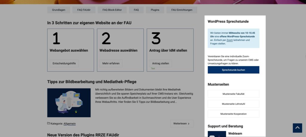 Um Personen bzw. Kontakte auf Ihrer Website einzubinden, wurde bisher das Personen-Plugin genutzt, welches Daten aus UnivIS verwendet. Dieses Plugin wird durch das RRZE nicht mehr weiterentwickelt und wird spätestens Ende nächsten Jahres deaktiviert. Ziehen Sie Ihre Kontakte deshalb bitte so bald wie möglich auf das neue RRZE FAUdir Plugin um.
