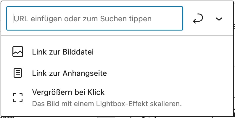 - Geben Sie im Eingabefeld eine interne oder externe URL ein, zu der Sie verlinken möchten oder wählen Sie eine bereits bestehende Seite aus.