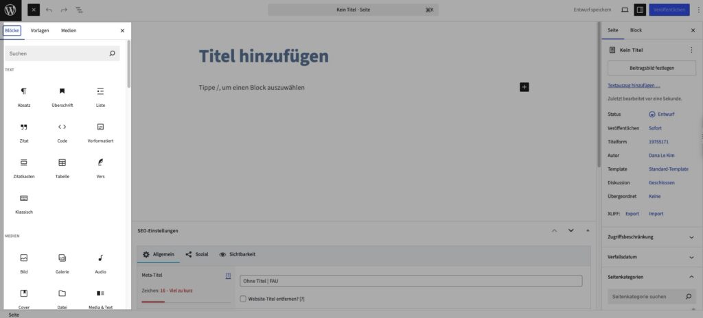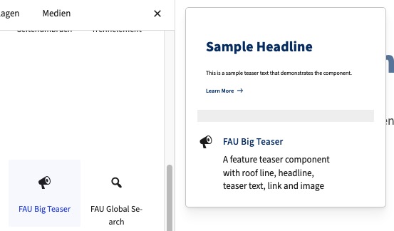 Per Mausklick wird der ausgewählte Block in den Inhaltsbereich zum Aufbau der Seite eingefügt. Sie können den Block auch ins Inhaltsfenster hineinziehen.