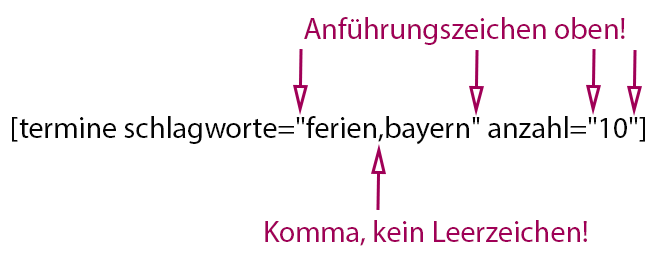 Der Shortcode wird eingeleitet durch termine. Anschließend können Sie über die vier angezeigten Attribute die Implementierungsdetails Ihrer Termine steuern.