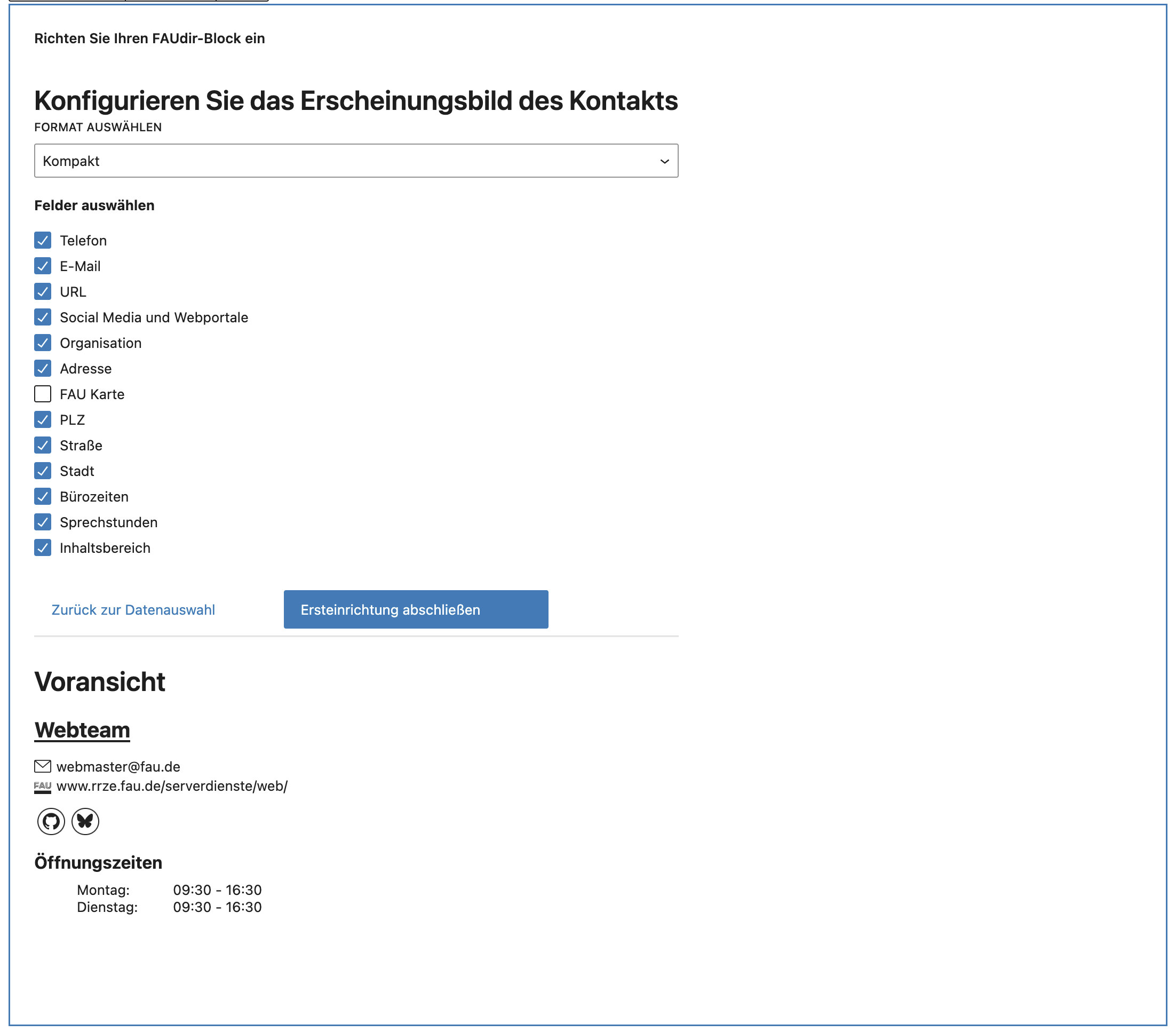 Ist man zufrieden, klickt man auf „Ersteinrichtung abschließen“. Dann werden alle gewählten Einstellungen übernommen und der Block wird auf der Seite angezeigt.