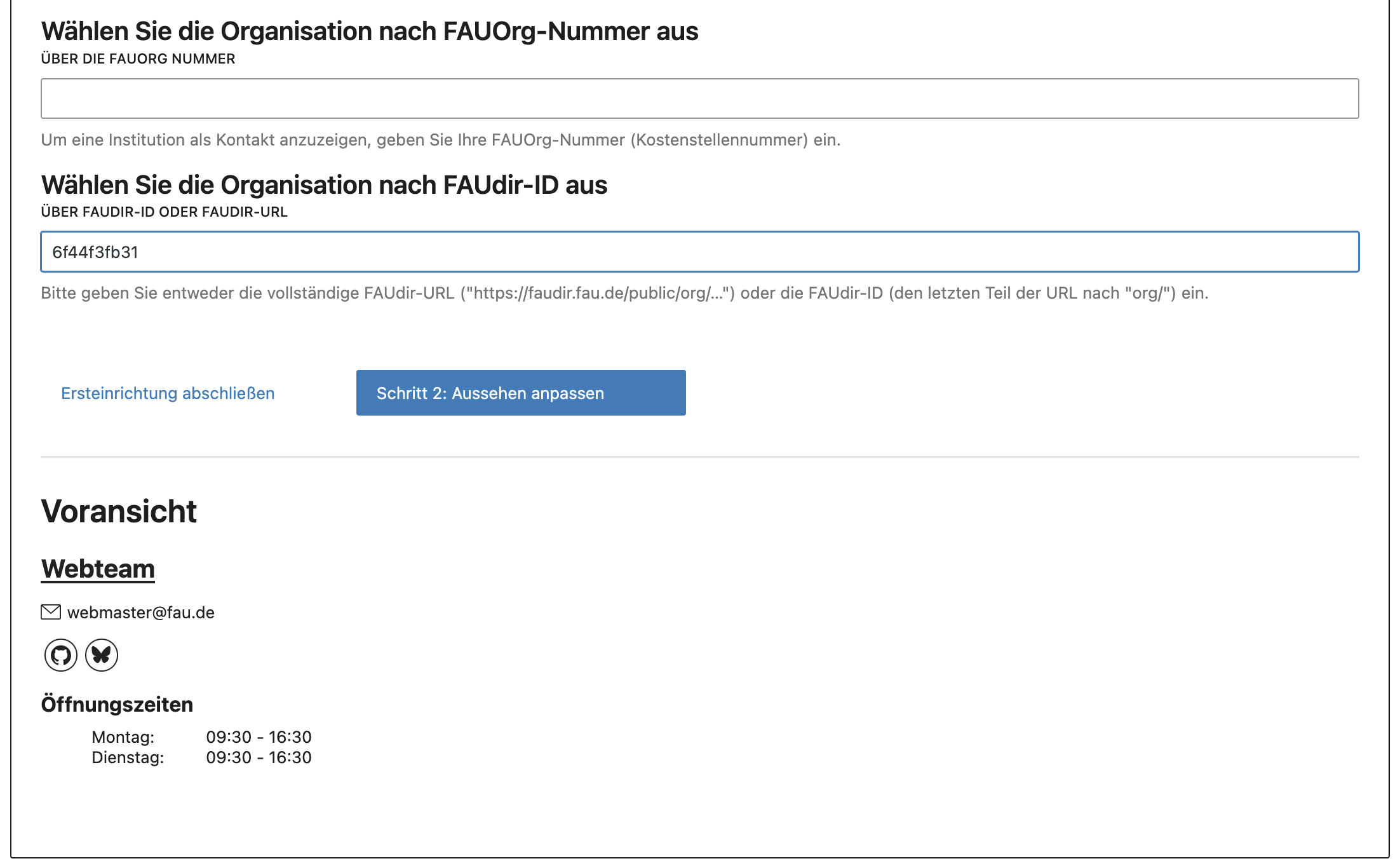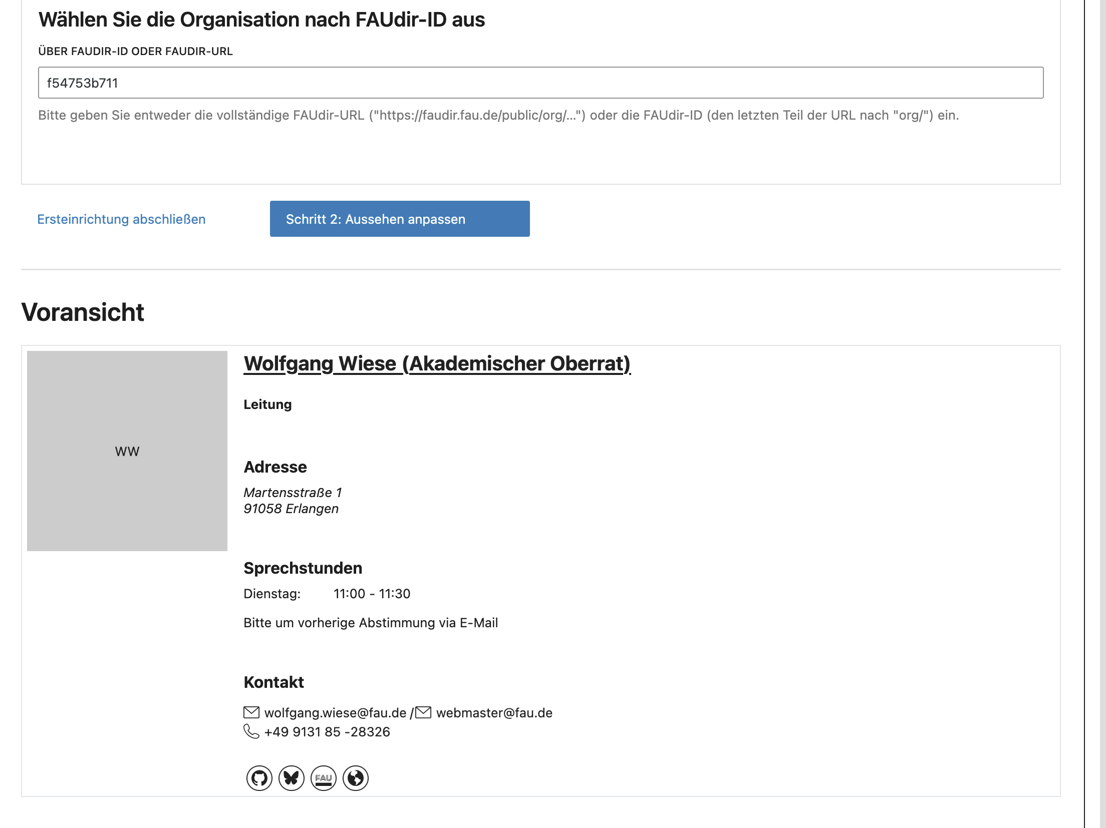 Sobald man eine gültige FAUorg-Nummer oder eine FAUdir ID eingibt, erscheint die Einrichtung oder der Folder bereits in der Voransicht.