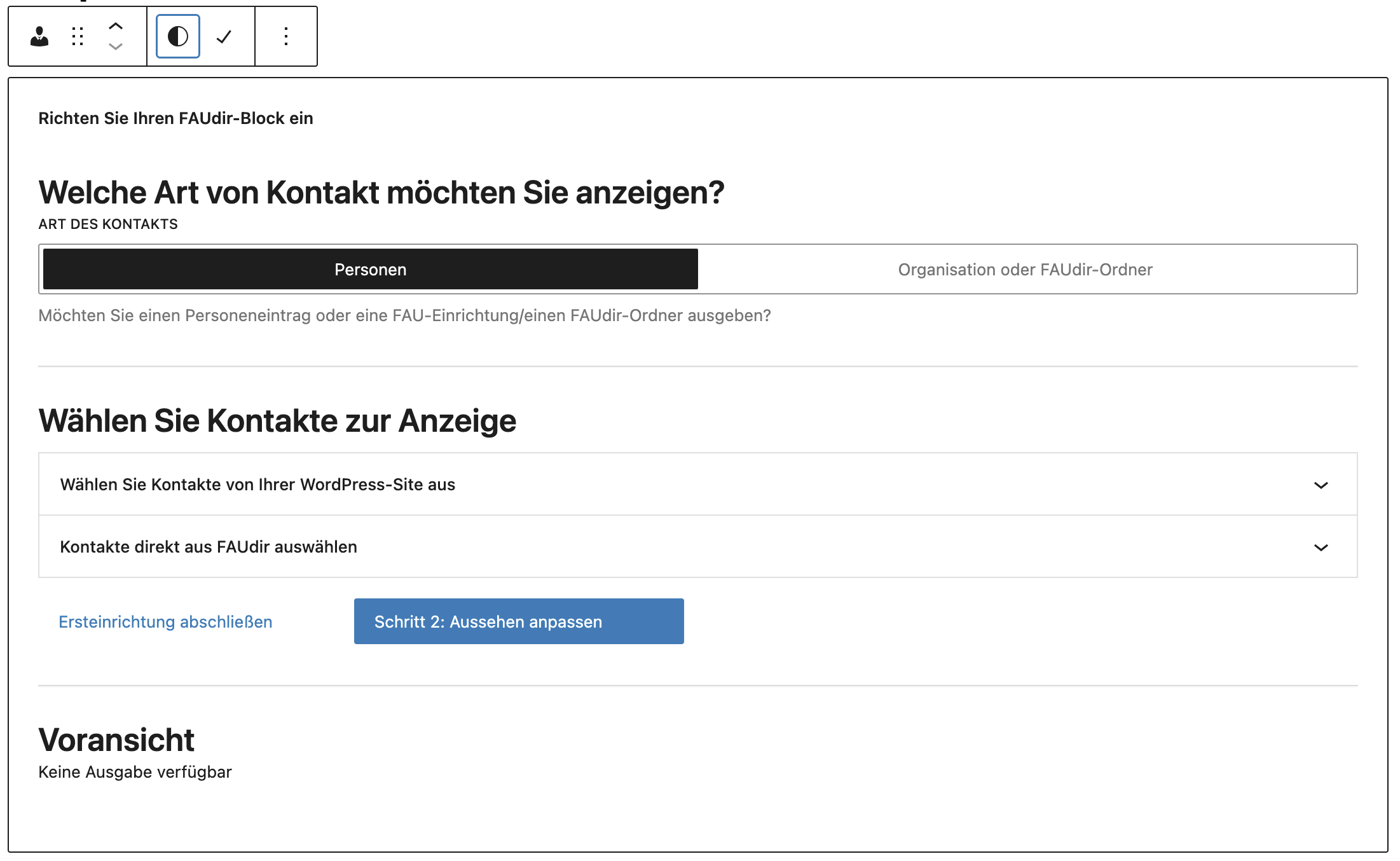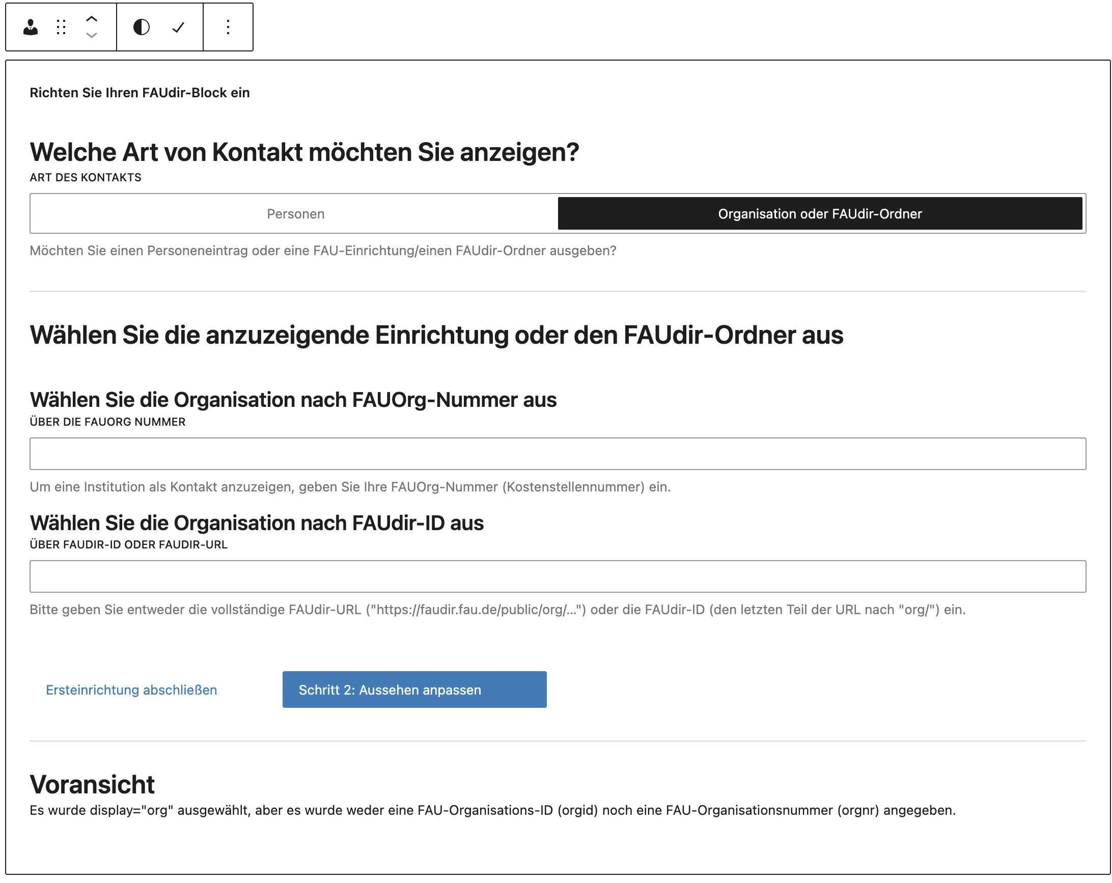 Wenn Sie den FAUdir-Block eingefügt haben, öffnet sich im Inhaltsbereich ein Konfigurationsfenster. Hier können Sie wählen, ob Sie eine Person oder eine Organisation oder FAUdir-Ordner einfügen möchten. Folgen Sie den einzelnen Schritten der Ersteinrichtung des Blocks.