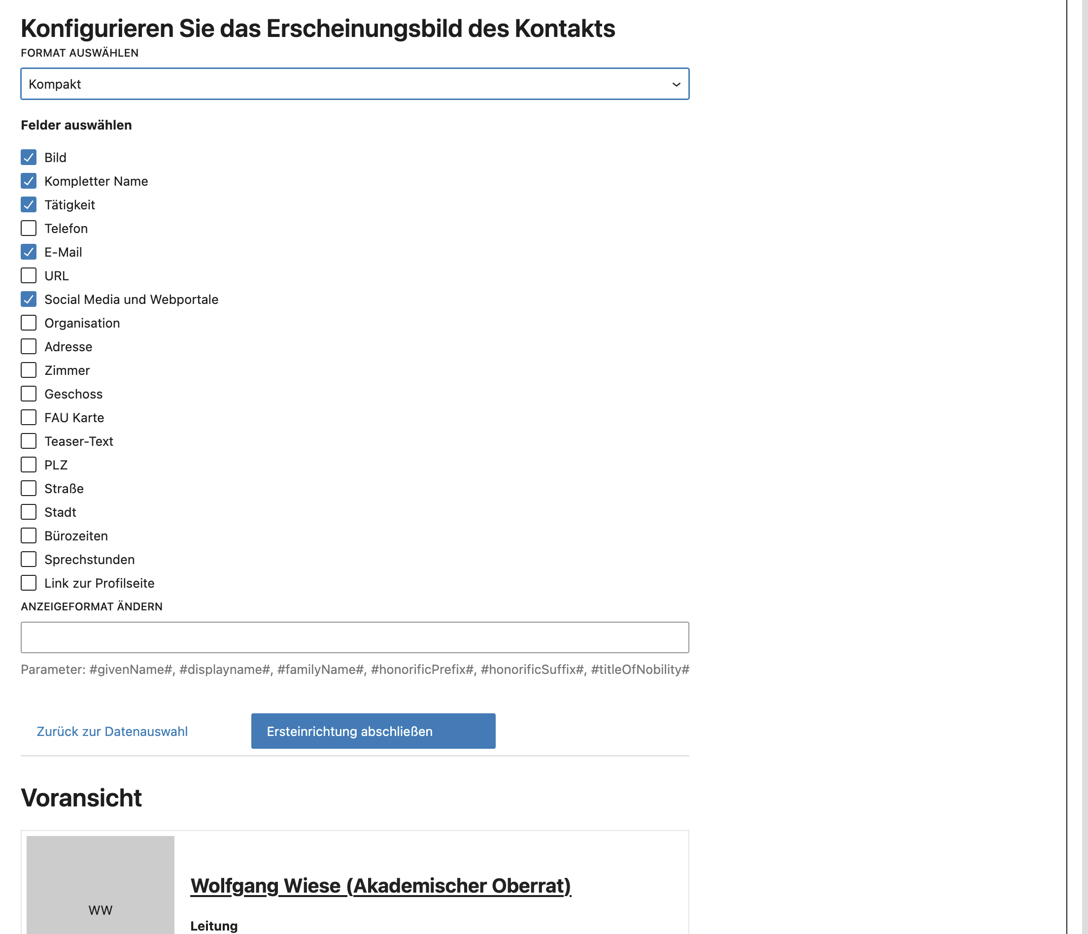 Als Standard ist stets die Kompaktansicht voreingestellt. Diese ist in der Auswahlliste „Format wählen“ voreingestellt. Darunter sieht man die möglichen Felder, die für die gewählten Person(en) angezeigt werden soll.