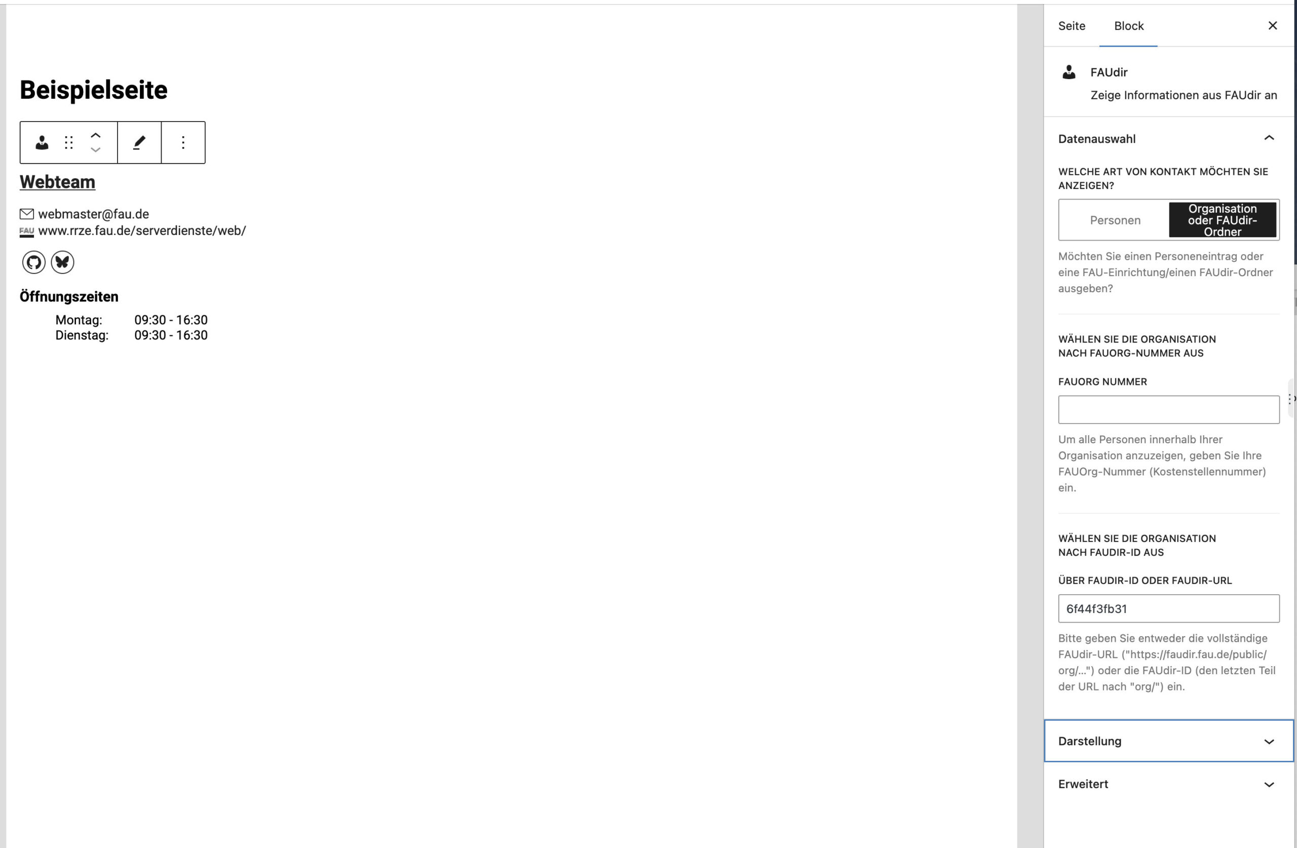 Wenn Sie mit dem Block-Editor arbeiten, können Sie an Stelle von Shortcodes den FAUdir Block verwenden.