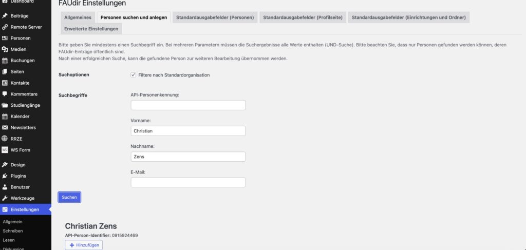 - Alternativ gelangen Sie über Einstellungen | RRZE FAUdir | Reiter „Personen suchen und anlegen“ dorthin.