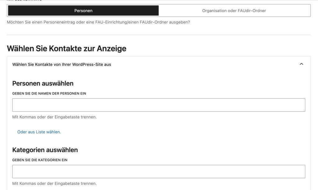 Sie finden hier praktische Beispiele für die Einbindung des FAUdir Blocks, um Personen auf Ihrer Website anzuzeigen. Eine Video-Anleitung ist in Arbeit.