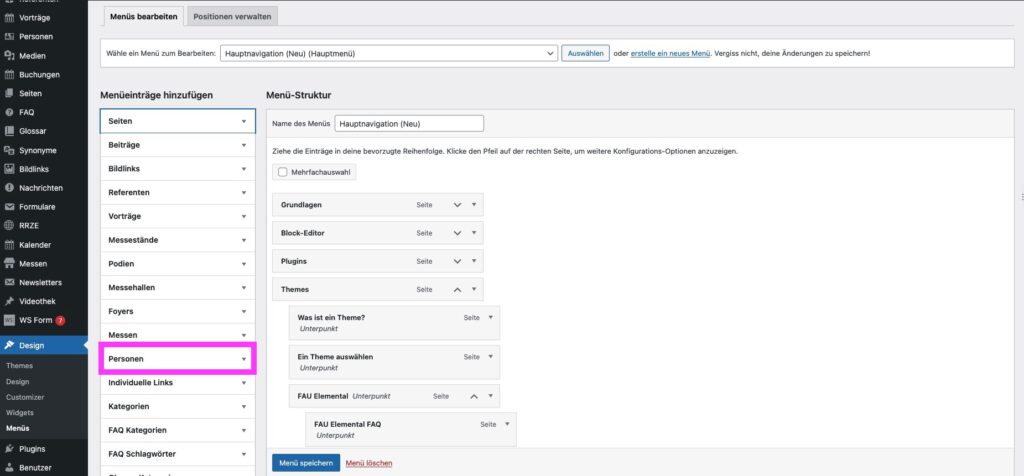 - Klappen Sie unter „Menüeinträge hinzufügen“ den Abschnitt Personen auf. Sie sehen eine Auflistung der Personen, die Sie zuvor über das FAUdir Plugin angelegt haben.