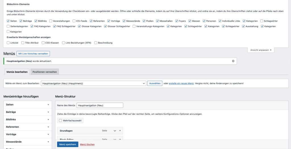 - Links im Abschnitt „Menüeinträge hinzufügen“ können Sie verschiedene Seitentypen zur Menü-Struktur hinzufügen.