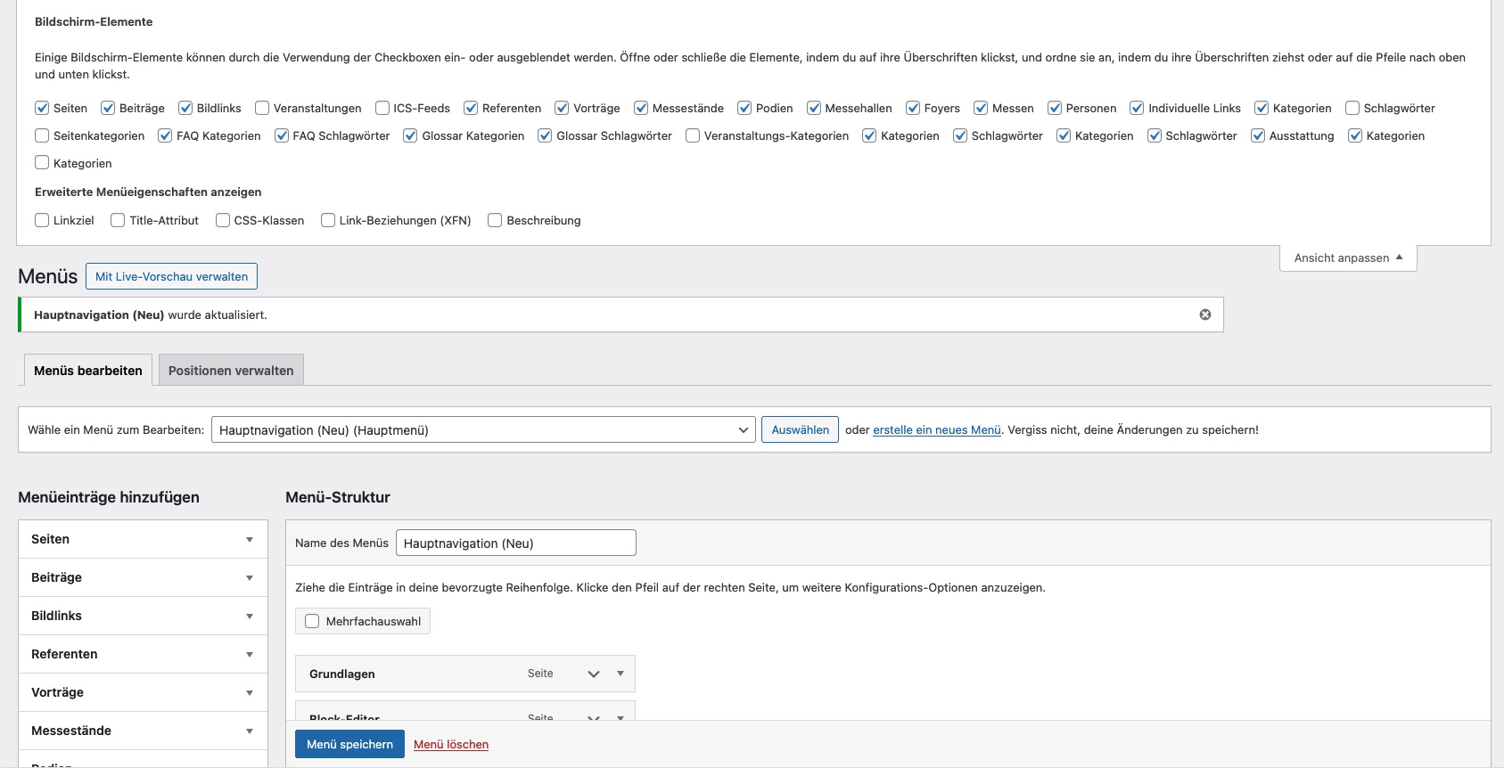 - Links im Abschnitt „Menüeinträge hinzufügen“ können Sie verschiedene Seitentypen zur Menü-Struktur hinzufügen.
