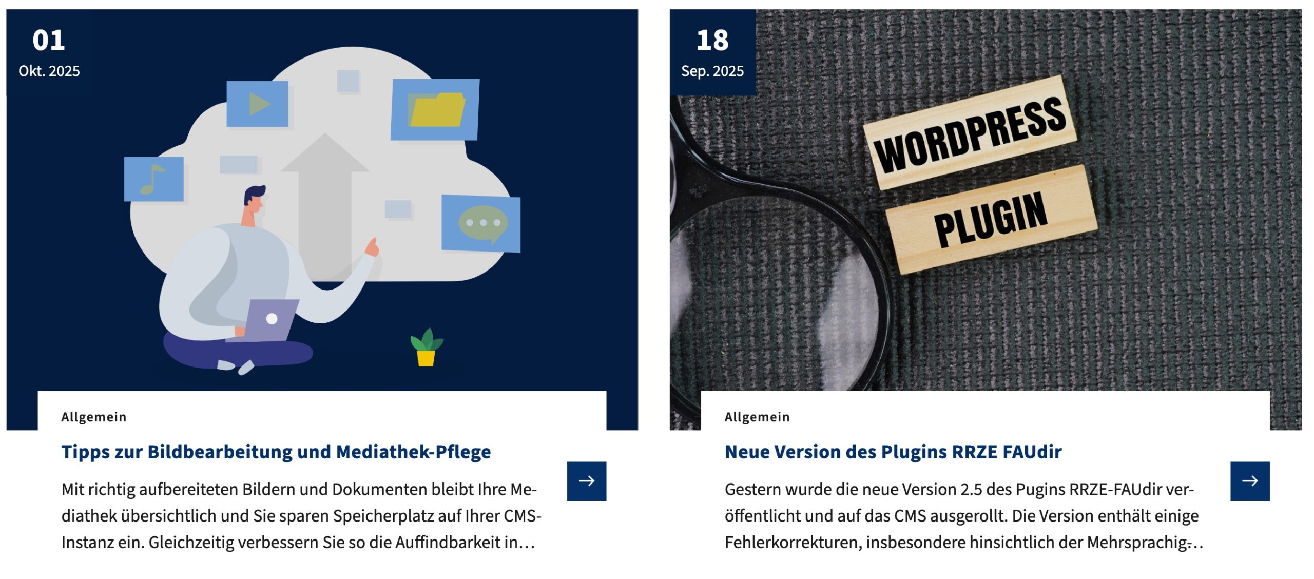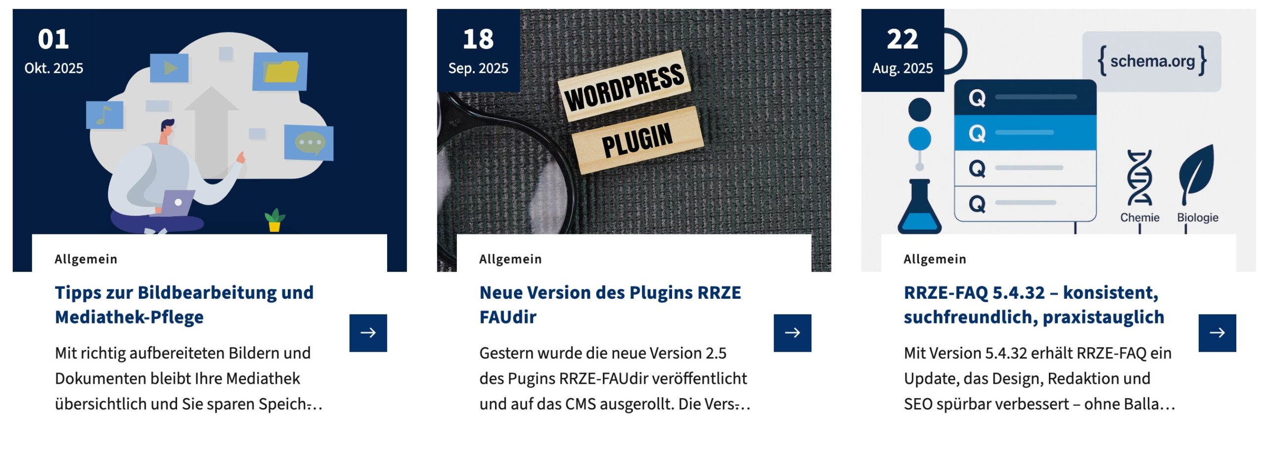 Der neue Block FAU Teaser Grid wird zur Anzeige der neuesten Beiträge oder bestimmter Seiten verwendet. Wenn Sie zuvor den Block Beitragsübersicht (Custom News Block) verwendet haben, wird dieser bei der Umstellung automatisch ins Teaser Grid umgewandelt.